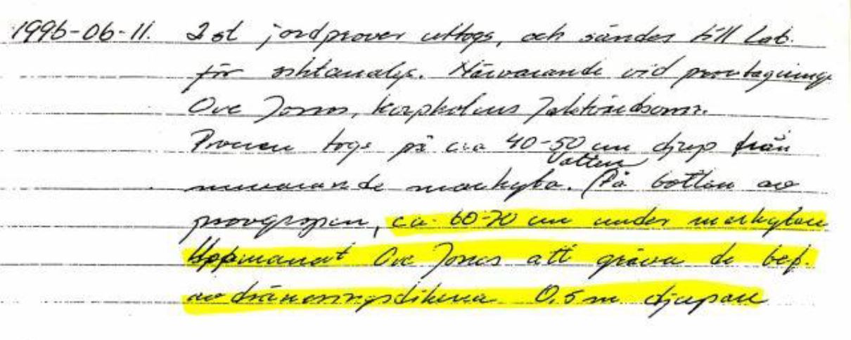 – ”Vatten på botten av provgropen, ca 60-70 cm under markytan”.